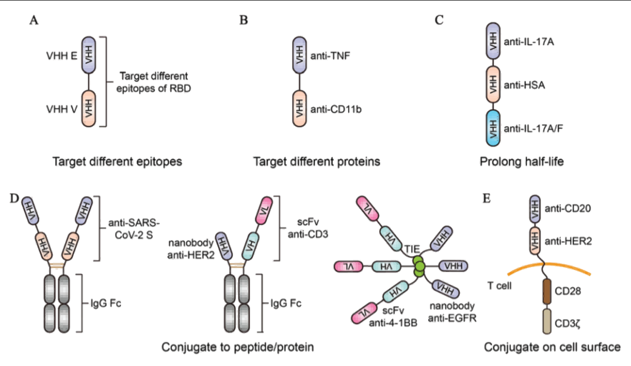 Bispecific Nanobodies are composed of two single-chain antibody fragments connected via tandem linkage, V-shaped structure, IgG-like structure, or other formats. Each single-chain antibody fragment has affinity for a different target, making bispecific nanobodies a type of nanobody with dual binding capabilities. They possess higher specificity, better targeting, and lower off-target toxicity, and can be used in the treatment of various diseases, including cancer, autoimmune diseases, and infectious diseases[1].