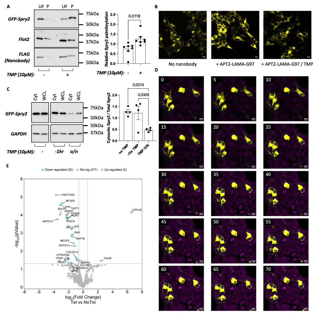The results demonstrated that the chemical genetics approach of LAMA + TMP successfully achieved rapid and reversible temporal control of the binding and de-palmitoylation activities of the nanobody chimeras. This chimeric protein was highly specific in its expression in cells, exerting minimal influence on the overall proteome and having a relatively limited effect on the remodeling of the palmitoylated proteome.