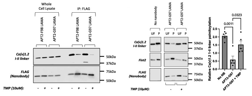 The results showed that by inserting cpDHFR into different positions of CDR3, two APT2-LAMA chimeras were constructed. In HEK293 cells, the addition of TMP significantly weakened the binding of G97-LAMA to YFP-α1C-II and completely blocked the de-palmitoylation activity of G97-LAMA. The effect of TMP on the binding and de-palmitoylation activity of F98-LAMA was relatively small.