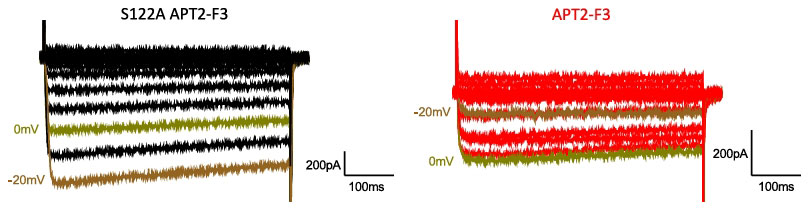 The study found that APT2-F3 can bind to and de-palmitoylate the Ca(v)1.2 α1C subunit, and this process is dependent on the presence of the β subunit. In cells expressing the full channel of Ca(v)1.2, APT2-F3 significantly shifted the activation curve V50 of the channel to the right by approximately -10 mV, mimicking the effect of the palmitoylation site mutation. In a monolayer of cardiomyocytes derived from human induced pluripotent stem cells, there was no difference in the resting action potential between expressing APT2-F3 or its inactivated mutant S122A-APT2-F3.