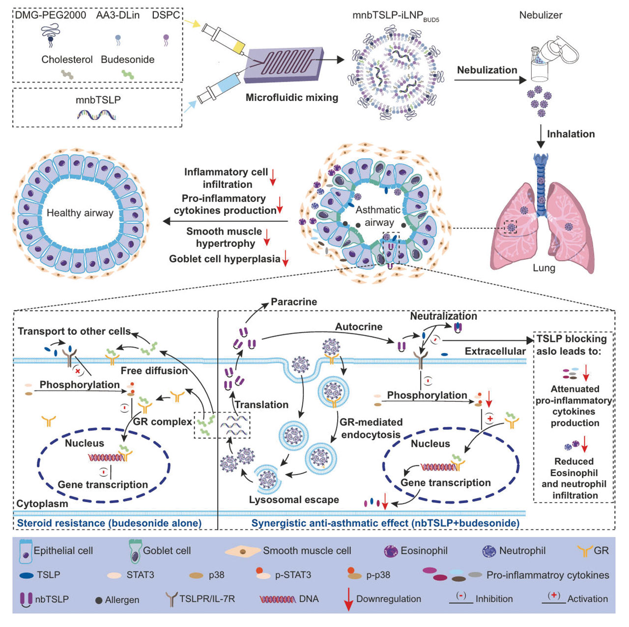 This study utilized inhaled lipid nanoparticles (iLNP) to simultaneously deliver mRNA encoding anti-TSLP nanobodies and budesonide into the lungs. After administration, the nanobodies blocked the upstream signals of TSLP and enabled budesonide to regain its anti-inflammatory activity. This was the first time that nanobodies were shown to "unlock" steroid resistance and restore the anti-inflammatory efficacy of budesonide. The synergistic effect of the two was stronger than that of a single therapy. Moreover, the content of budesonide used in mnbTSLP-iLNPBUD5 was only one-third of the clinical dosage, yet it achieved superior results. It not only effectively reduced the probability of steroid resistance but also reduced the side effects such as osteoporosis and elevated blood sugar caused by long-term use of budesonide by patients. This formed a "1 + 1 + 1 far greater than 3" synergistic effect.