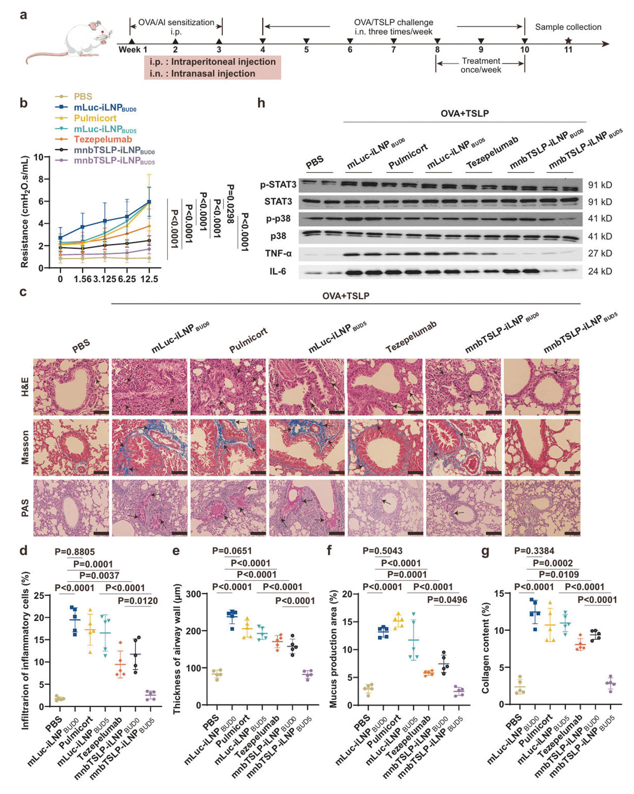 The results showed that the airway hyperresponsiveness (AHR) of the mice in the budesonide group did not improve, and the resistance continued to rise, being three times that of the healthy group; although the Tezepelumab group demonstrated certain efficacy, the airway resistance of this group still showed a moderate increase, and the efficacy of the airway inflammation and remodeling indicators was still lower than that of the mice in the mnbTSLP-iLNPBUD5 group. Only the mice treated with mnbTSLP-iLNPBUD5 maintained stable airway resistance under methacholine stimulation, and the phosphorylation levels of p38 MAPK and STAT3 in the lungs of this group decreased to 1.2 times that of the healthy mouse control group, and the airway remodeling indicators were significantly improved, approaching those of the healthy mice.