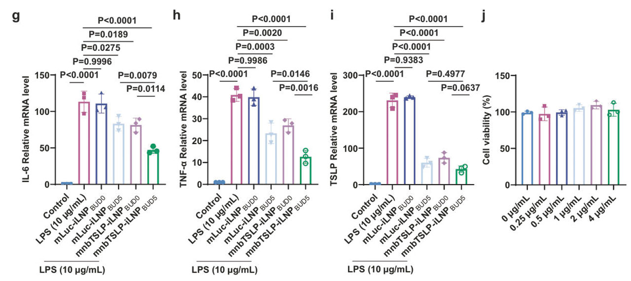 In the experimental data, due to the protective effect of the mnbTSLP-iLNPBUD5 scaffold, the mRNA levels of IL-6, TNF-α and TSLP in this group decreased by 78%, 65% and 52% respectively, which was significantly better than that of the control group.