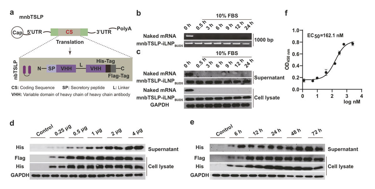 The test results show that the 35 kDa anti-TSLP nanobody, which was successfully expressed in 16HBE cells after being delivered by iLNPBUD5 through in vitro transcription, can be secreted outside the cells and specifically bind to TSLP. The binding affinity is 162.1 nM, effectively blocking the binding of TSLP to the receptor (TSLPR/IL-7R), thereby reducing the activation of the p38 MAPK and STAT3 inflammatory signaling pathways, and effectively inhibiting the occurrence and development of the inflammatory response from the upstream. At the same time, the researchers found that iLNPBUD5 can effectively reduce the degradation rate of mRNA, and the anti-TSLP nanobody can be continuously secreted after transfection for up to 72 hours.
