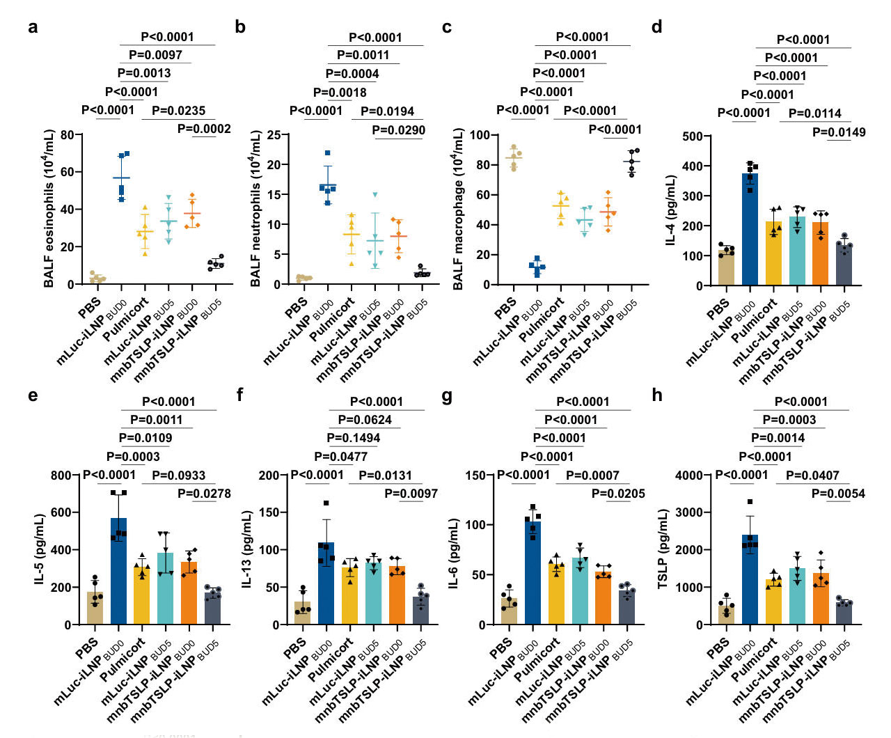 In order to further confirm the therapeutic effect of mnbTSLP-iLNPBUD5 on steroid resistance, the research team established a steroid-resistant asthma mouse model by repeatedly stimulating with OVA and injecting TSLP simultaneously. Then, mnbTSLP-iLNPBUD5, budesonide and Tezepelumab were respectively administered for testing and comparison.