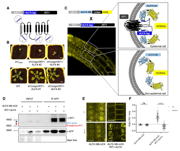 Arabidopsis IRT1 is a key transporter for iron uptake. Its complex multi-transmembrane domain topology means that N- or C-terminal tagging often disrupts its function. Traditional fluorescent protein insertion is only effective in specific extracellular loops, frequently leading to loss of function. The research team utilized the ALFA nanobody system to achieve functional tagging and analysis of IRT1.