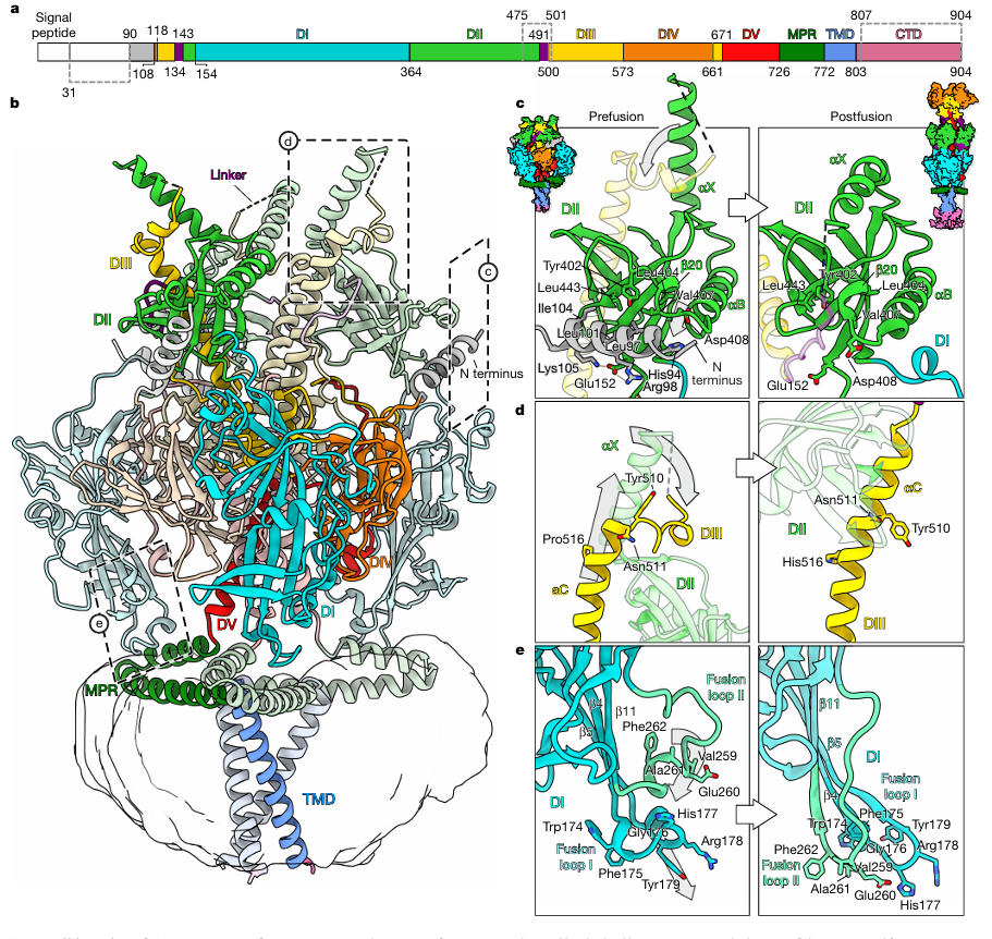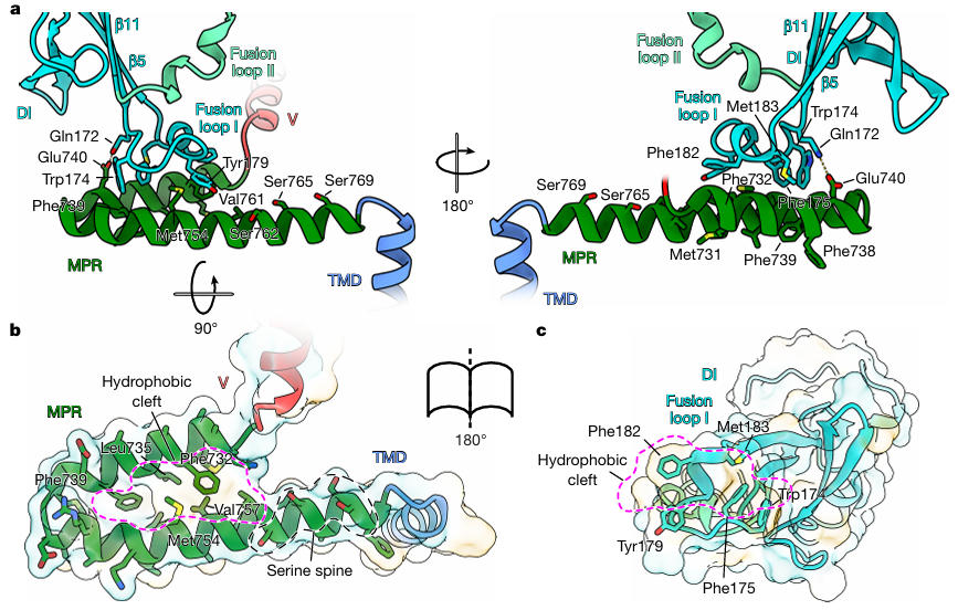 The research team reconstituted the stabilized HSV-1 gB into peptidiscs and then resolved the prefusion structure to a resolution of 2.74 Å using single-particle cryo-EM (Figure 3). This structure revealed several previously unknown key features for the first time: The N-terminal residues 90-106 form an alpha helix that inserts into a groove between DI and DII, stabilized by hydrophobic interactions (L97, I104) and a salt bridge (R98-E152); Fusion loop I (residues 174-179) is not a linear structure as traditionally thought but coils into a 2-turn 3₁₀ helix, precisely embedding into the hydrophobic cleft of the Membrane Proximal Region (MPR) (Figure 4).