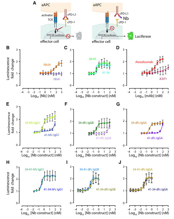 Results showed that all nanobody constructs significantly increased luciferase activity, except the non-blocking monovalent Nb41, indicating effective blockade of the cPD-1/cPD-L1 signaling pathway. Notably, bispecific constructs containing Nb41 had a better blocking effect than Nb34 alone, while Nb41-Fc and JC071 only slightly increased luciferase activity at high concentrations, further confirming that JC071 likely acts through steric hindrance.