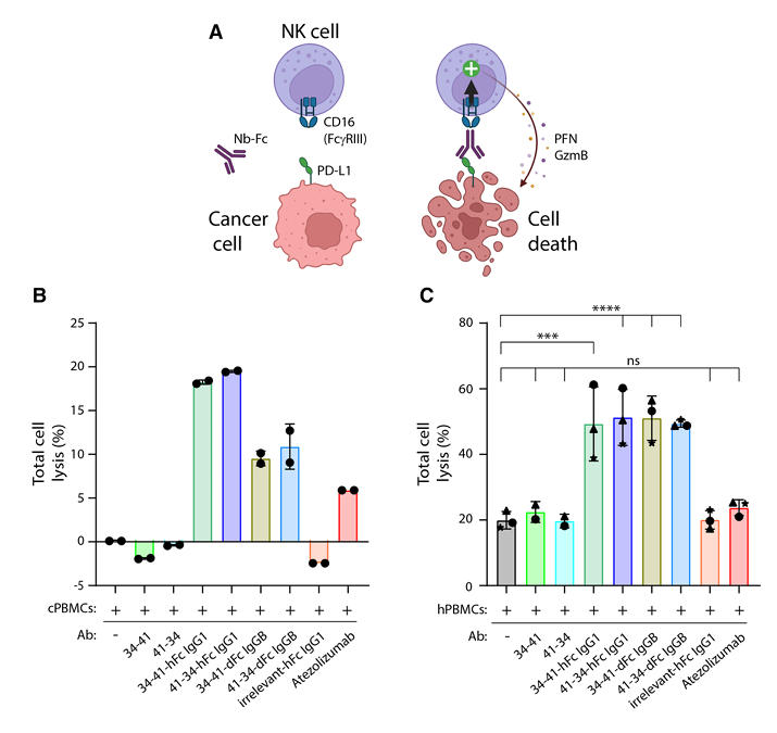 The research team also investigated the ability of nanobody constructs carrying functional Fc domains to induce ADCC effects. Purified human Natural Killer (NK) cells were co-cultured with cPD-L1-expressing HeLa cells in the presence of varying concentrations of nanobody constructs. Results showed that bispecific constructs carrying the human IgG1 Fc domain efficiently induced ADCC at low picomolar concentrations; constructs carrying the canine IgGB Fc domain could also induce a certain degree of ADCC at high concentrations (100 nM).