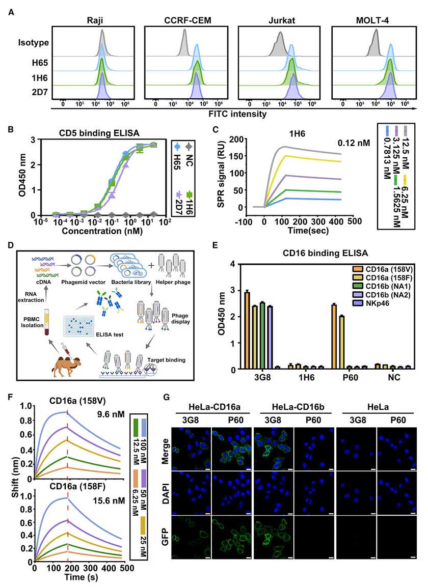 To obtain nanobodies specifically binding CD16a, the team immunized alpacas with the CD16a extracellular domain and constructed a Variable Heavy chain of Heavy-chain antibody (VHH) phage library. After four rounds of biopanning, clone P60 was selected, which bound only to CD16a and not to CD16b. Bio-Layer Interferometry (BLI) confirmed P60's specific binding to CD16a with affinities of 9.6 nM (158V variant) and 15.6 nM (158F variant), and no binding to CD16b, thereby avoiding potential in vivo side effects associated with CD16b engagement.