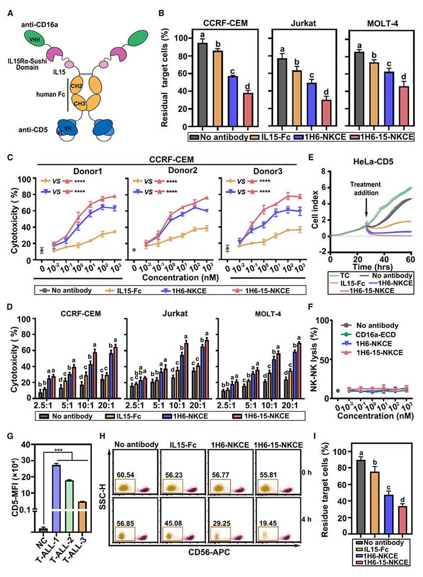 In vitro experiments showed that after 1H6-15-NKCE treatment, the proportion of residual CD5+tumor cells was significantly lower than in groups treated with 1H6-NKCE or IL-15-Fc. For NK cells derived from different donors, 1H6-15-NKCE consistently and significantly enhanced their killing activity against CD5+tumor cells, with the most pronounced effect at an Effector-to-Target (E:T) ratio of 10:1. RTCA revealed that NK cells activated by 1H6-15-NKCE exhibited superior long-term killing efficacy against HeLa-CD5 cells compared to those activated by 1H6-NKCE, and no NK cell fratricide was observed. For three primary CD5+T-ALL patient samples, 1H6-15-NKCE-mediated allogeneic and autologous NK cells both demonstrated enhanced tumor clearance capability.