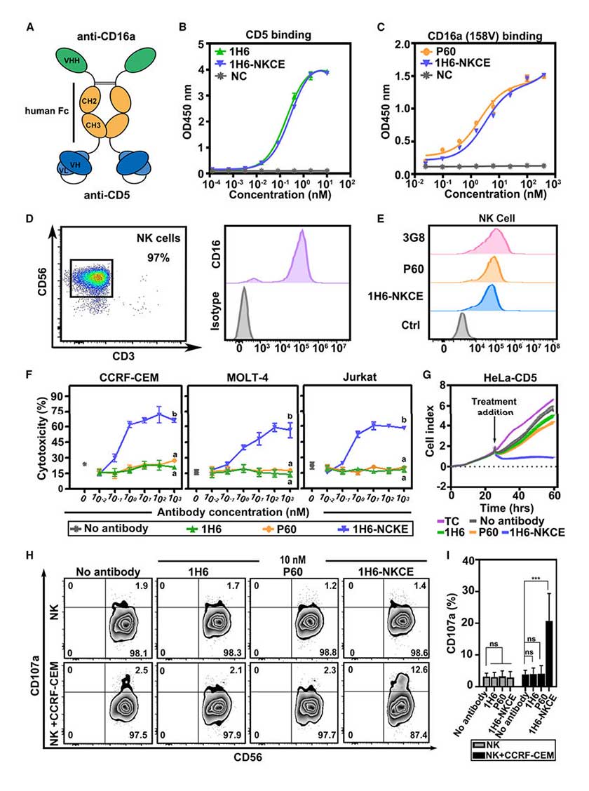 The research team constructed the bispecific engager 1H6-NKCE by linking the anti-CD16a nanobody P60 and the anti-CD5 scFv via a human IgG4 Fc fragment. SDS-PAGE confirmed its correct expression and purification. ELISA and BLI validation showed that 1H6-NKCE could simultaneously bind to both CD5 and CD16a (158V/F), without binding to CD16b.