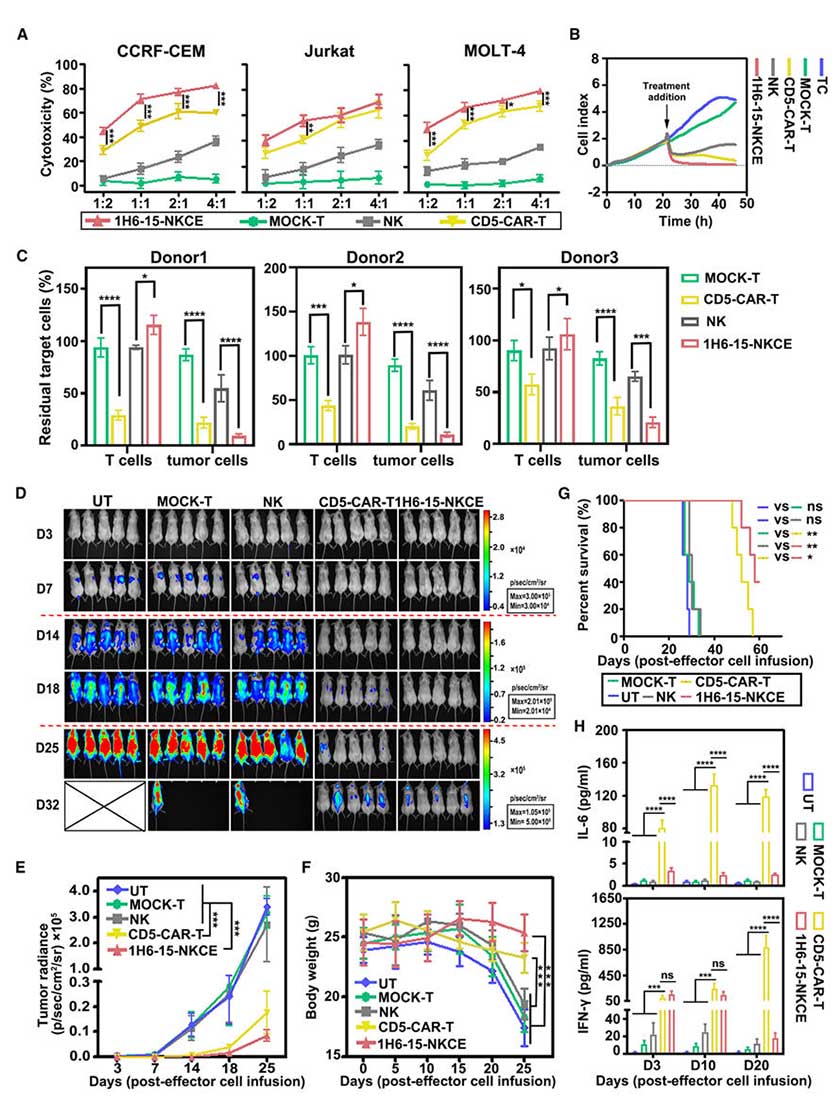 Compared to CD5-CAR-T therapy, NK cells activated by 1H6-15-NKCE showed comparable killing activity against CD5+tumor cells in vitro but exhibited no toxicity toward normal autologous T-cells. In contrast, CD5-CAR-T cells killed both normal T-cells and tumor cells. In the MOLT-4-ffLuc xenograft model, both the 1H6-15-NKCE + NK cells group and the CD5-CAR-T group significantly suppressed tumor growth. However, mice in the 1H6-15-NKCE group showed no significant decrease in body weight, had lower serum IL-6 levels (suggesting a lower risk of cytokine release syndrome), and 2 out of 5 mice were still alive at 60 days, indicating superior efficacy and safety.