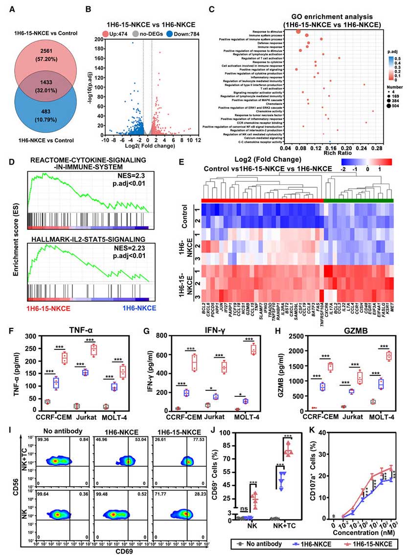 Transcriptomic analysis revealed that compared to 1H6-NKCE, NK cells treated with 1H6-15-NKCE showed significant enrichment in pathways related to immune response, cytokine signaling, and chemotaxis. The JAK/STAT pathway was upregulated due to IL-15 signaling activation, and the secretion of cytokines such as IFN-γ, GZMB, and TNF was significantly increased. Detection of the activation marker CD69 and the degranulation marker CD107a confirmed that 1H6-15-NKCE more potently activated NK cells.