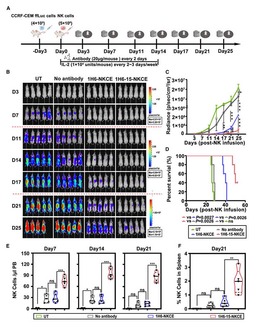 In a CCRF-CEM-ffLuc xenograft model, the group receiving 1H6-15-NKCE combined with NK cells showed a significantly lower tumor burden compared to the 1H6-NKCE group. The median survival time was extended from 40 days to 50 days (p < 0.01). The number of NK cells in peripheral blood and spleen significantly increased, confirming its ability to enhance the in vivo persistence of NK cells.