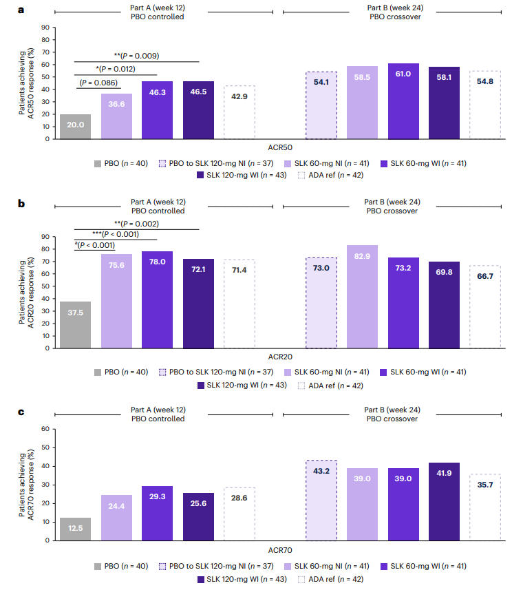 Regarding joint symptom improvement, at Week 12, the ACR50 response rates for the Sonelokimab 60 mg WI and 120 mg WI groups were 46.3% and 46.5%, respectively, significantly higher than the placebo group's 20.0% (P < 0.05, P < 0.01). The 60 mg NI group achieved a 36.6% response, which was not statistically significant versus placebo (P = 0.086). By Week 24, the ACR50 response rates in the Sonelokimab dose groups further improved to 58.1%–61.0%. Notably, patients who switched from placebo to SLK 120 mg NI at Week 12 achieved an ACR50 response rate of 54.1% at Week 24, compared to 54.8% in the adalimumab group, fully demonstrating the sustained control of joint inflammation by Sonelokimab.