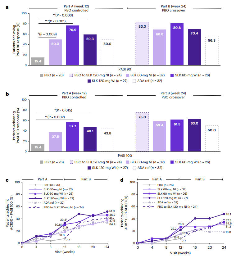 Regarding skin symptom improvement, at Week 12, the PASI 90 response rates for the Sonelokimab 60 mg WI and 120 mg WI groups were 76.9% and 59.3%, respectively, both significantly superior to the placebo group's 15.4% (P < 0.001, P = 0.003). By Week 24, the PASI 100 response rate reached up to 63.0% in the SLK groups. Particularly noteworthy, patients who switched from placebo to SLK treatment saw their PASI 100 response rate surge from 15.4% at Week 12 to 75.0% at Week 24, demonstrating the powerful skin clearance capability of SLK.