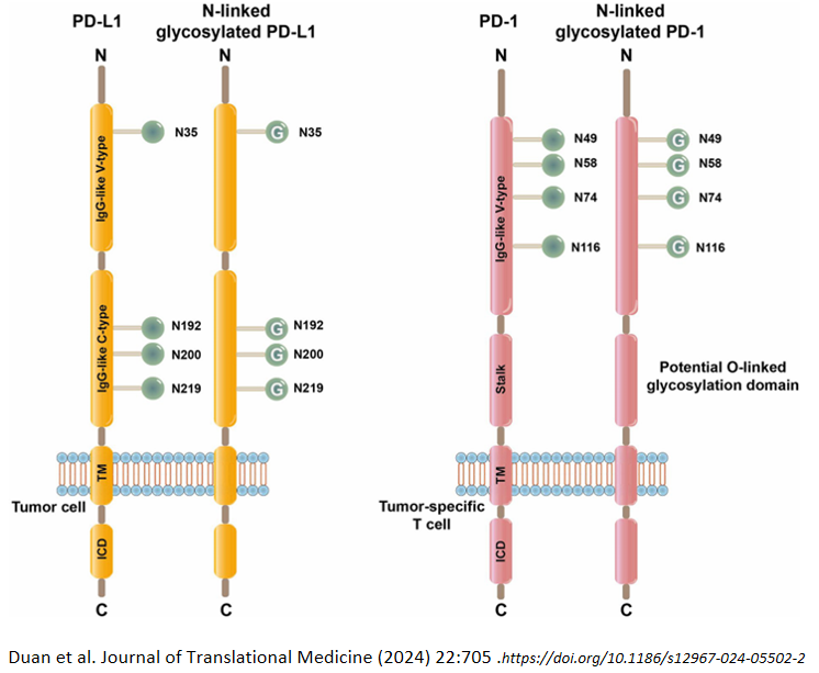 [1] Duan Z, Shi R, Gao B, Cai J. N-linked glycosylation of PD-L1/PD-1: an emerging target for cancer diagnosis and treatment. J Transl Med. 2024 Jul 30;22(1):705.