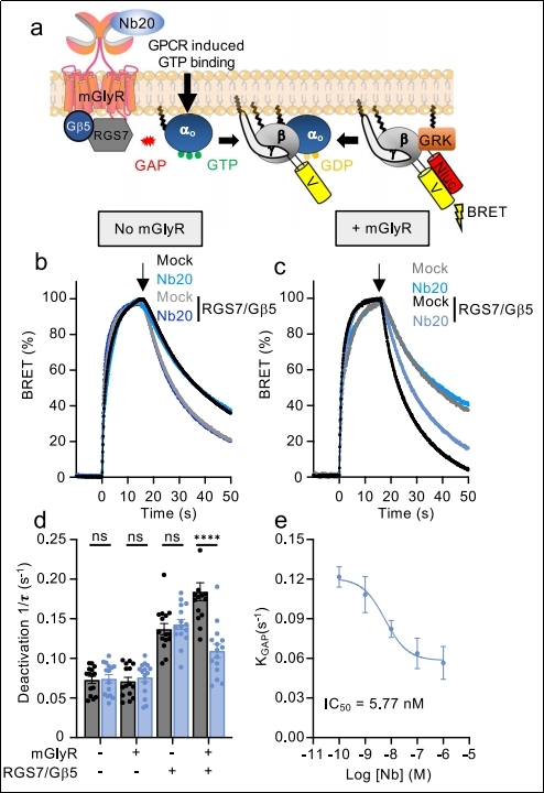 • Functional Validation: In a BRET-based GAP activity assay, Nb20 couldspecifically inhibitthe deactivation of the Gαo protein mediated by the mGlyR-RGS7/Gβ5 complex, with an IC50 of approximately6 nM. This indicates that Nb20 mimics the "inhibitory" effect of the endogenous ligand glycine (see Fig. 2b,c,d,e).