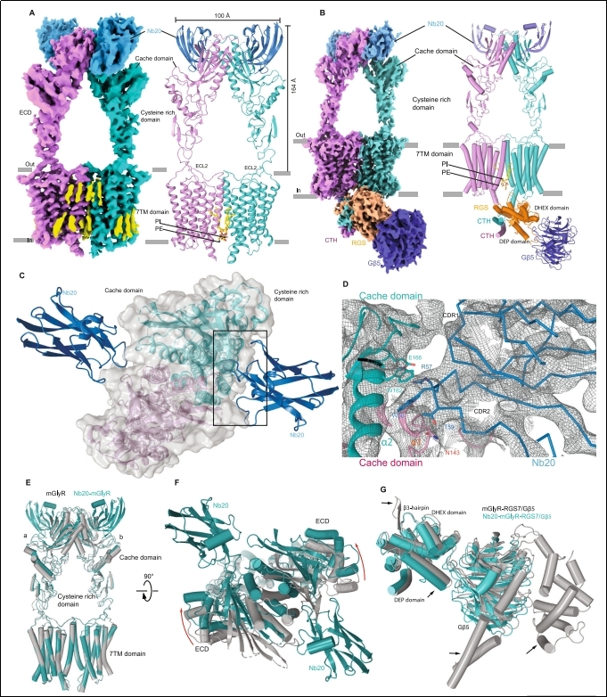 • Structural Determination: The research team successfully resolved the cryo-electron microscopy (cryo-EM) structures of the Nb20-mGlyR and Nb20-mGlyR-RGS7/Gβ5 complexes (with resolutions of 3.49 Å and 3.89 Å, respectively) (see Fig. 3a,b).