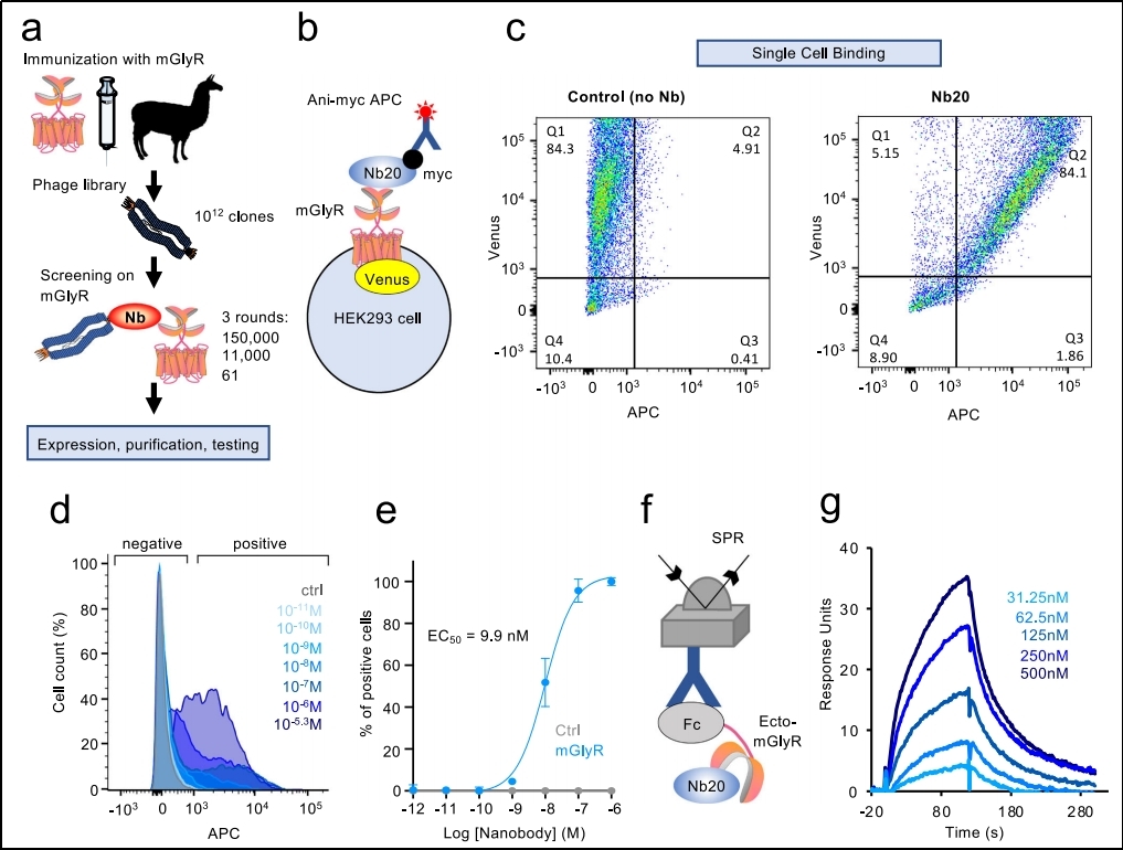 • Development Pipeline: Alpacas were immunized with mGlyR to construct a phage display library. After multiple rounds of high-throughput screening, the clone with the strongest binding—Nb20—was identified from 61 enriched clones (see Fig. 1a).