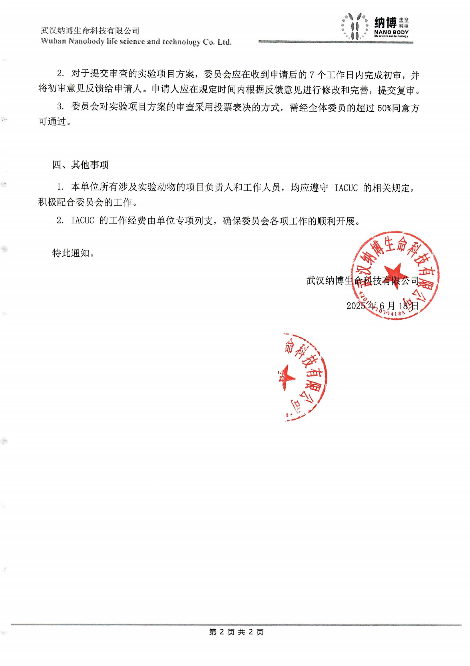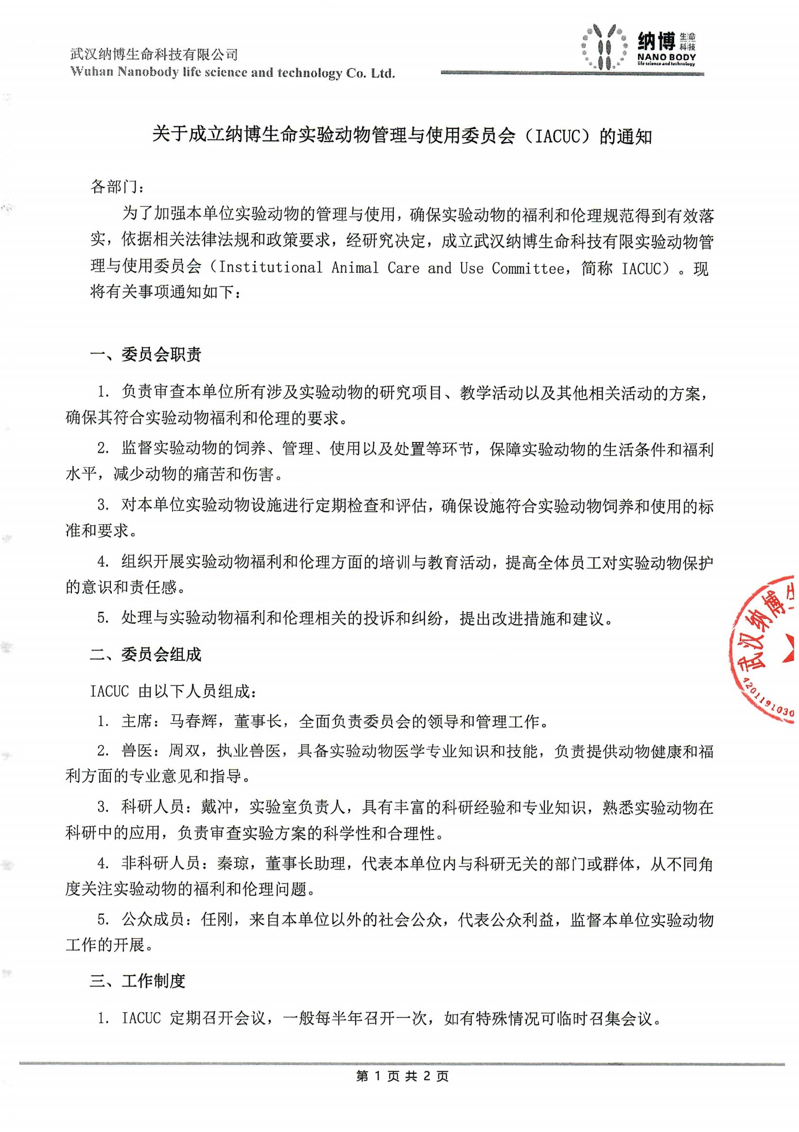 Various departments: In order to strengthen the management and use of experimental animals within our unit, and to ensure the effective implementation of the welfare and ethical standards for experimental animals, in accordance with relevant laws, regulations and policy requirements, after thorough research, it has been decided to establish the Wuhan Nabao Life Science Technology Co., Ltd. Institutional Animal Care and Use Committee (Institutional Animal Care and Use Committee, abbreviated as IACUC). The following are the relevant matters to be notified: