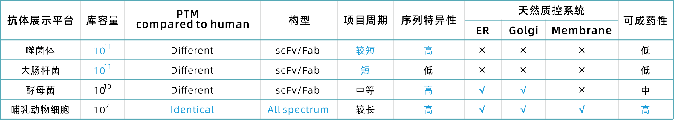 Of course, although Pd and Yd have obvious disadvantages in terms of configuration and drugability, they still have certain advantages. Besides the large library capacity, their lower cost and slightly shorter cycle are also important factors that customers will consider. The specific advantages and disadvantages of phage display, Escherichia coli display, yeast display and mammalian cell display are detailed in Table 1.