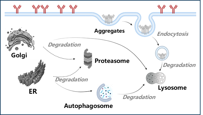 Figure 2. Mammalian cells demonstrate ensuring high drugability: QC system. Both ER and Golgi can degrade "problematic" proteins through the proteasome, or enter the lysosome through autophagosomes for degradation. For unstable membrane proteins, aggregated proteins can be transported to the lysosome for degradation through endocytosis.