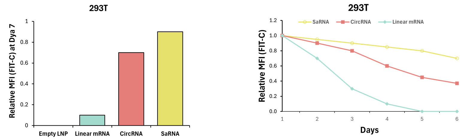In vitro luciferase assays demonstrated that circular RNA and self-replicating RNA outperformed conventional linear RNA in both gene expression level and duration.