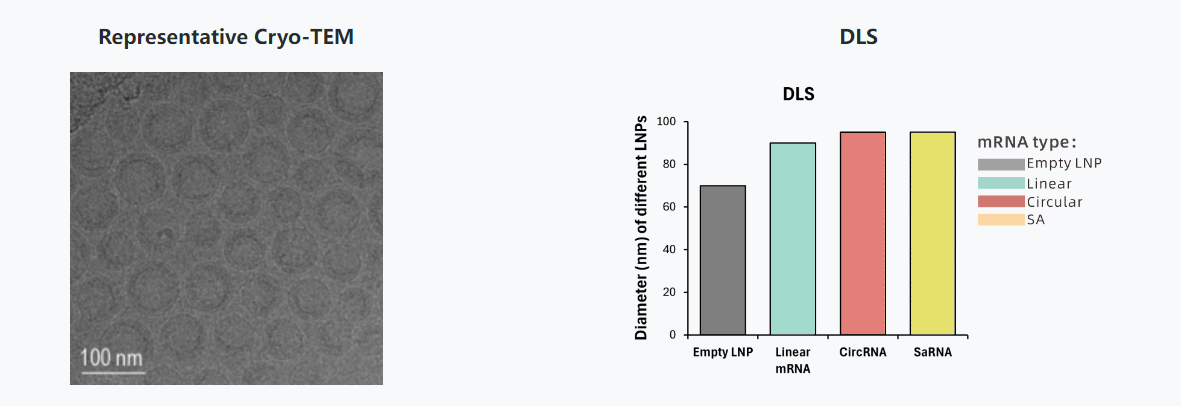 DLS and Cryo-EM data show that the mRNA-LNP prepared by NBLST exhibits excellent particle size uniformity.
