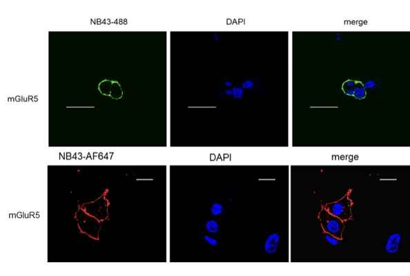mGluR5 nanobody NB43 labeled with AF488 or AF647 provides flexibility for various experimental requirements: